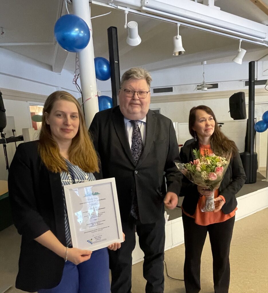 Kunnianosoituksen ottivat vastaan Eva Älander, hoivalautakunnan puheenjohtaja sekäTherese Metz, kunnanhallituksen kansallisista vähemmistöasioista vastaava kunnanneuvos. Kuvassa myös valtuuskunnan puheenjohtaja Anders Eriksson.