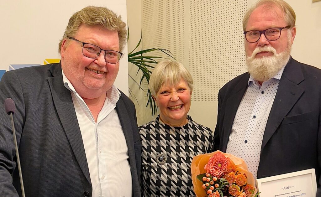 Kuvassa Anders Eriksson valtuuskunnan puheenjohtaja, Heli Lindström valtuuskunnan varapuheenjohtaja ja Jarmo Lainio emeritusprofessori Tukholman yliopistossa.